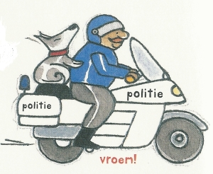 Politieman Piet zet zijn motor onmiddellijk aan de kant en gaat hem zoeken.